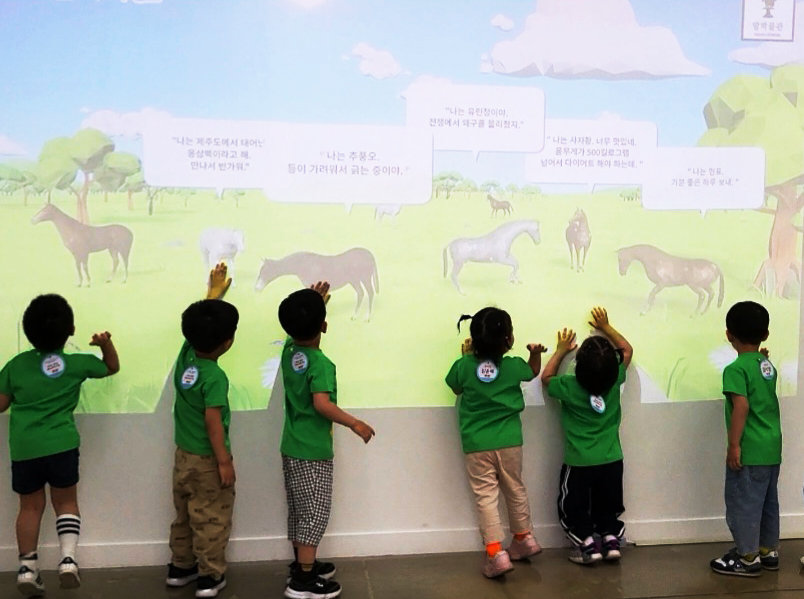 말박물관을 찾아 터치 스크린을 통해 말에 대해 배우는 어린이 단체관람객 사진제공|한국마사회