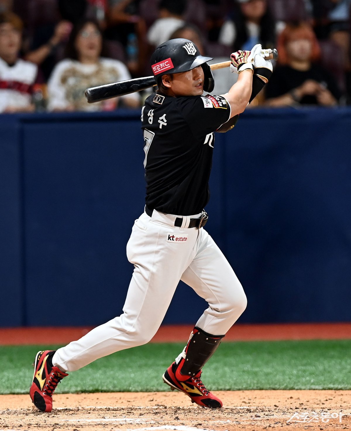 17일 서울 고척스카이돔에서 ‘2024 신한 SOL 뱅크 KBO리그’ 키움 히어로즈와 KT 위즈의 경기가 열렸다. 5회초 1사 1, 3루에서 KT 김상수가 2타점 3루타를 날리고 있다. 고척 | 김민성 기자 marineboy@donga.com