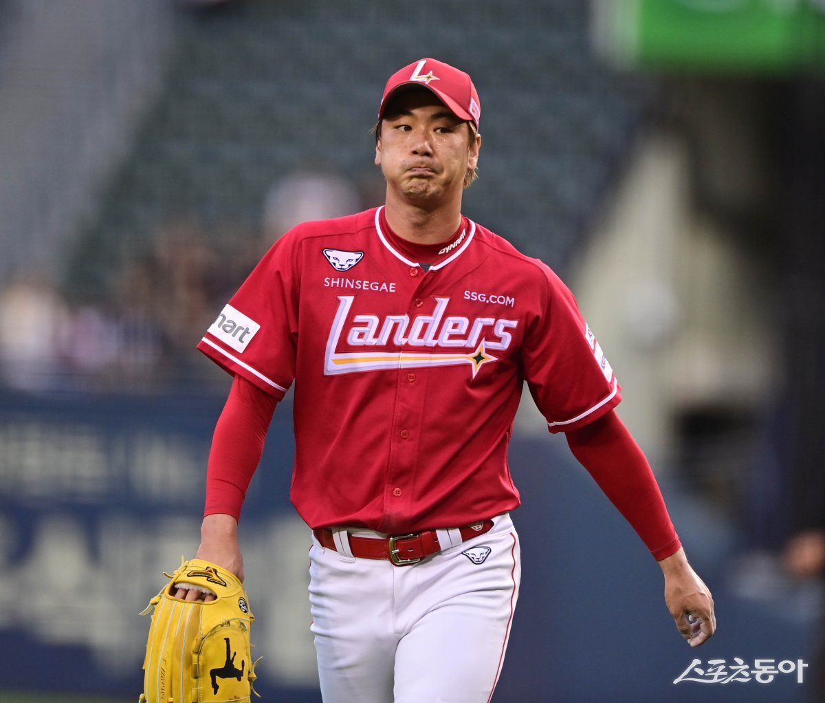 17일 서울 잠실야구장에서 열린 ‘2024 신한 SOL 뱅크 KBO리그’ SSG 랜더스와 LG 트윈스의 경기에서 1회초 3실점한 SSG 김광현이 아쉬워하고 있다. 잠실 | 주현희 기자 teth1147@donga.com