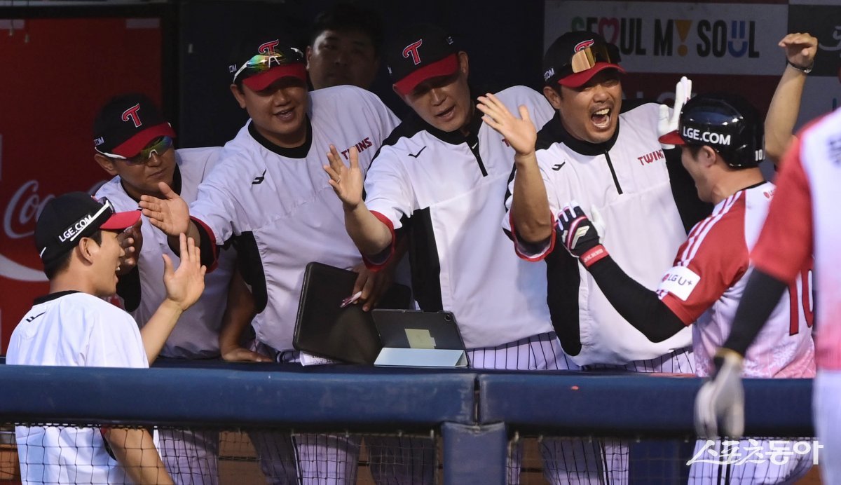 17일 서울 잠실야구장에서 열린 ‘2024 신한 SOL 뱅크 KBO리그’ SSG 랜더스와 LG 트윈스의 경기에서 3회말 1사 만루, 중월 만루 홈런을 친 LG 오지환이 이호준 코치의 축하를 받고 있다. 잠실 | 주현희 기자 teth1147@donga.com