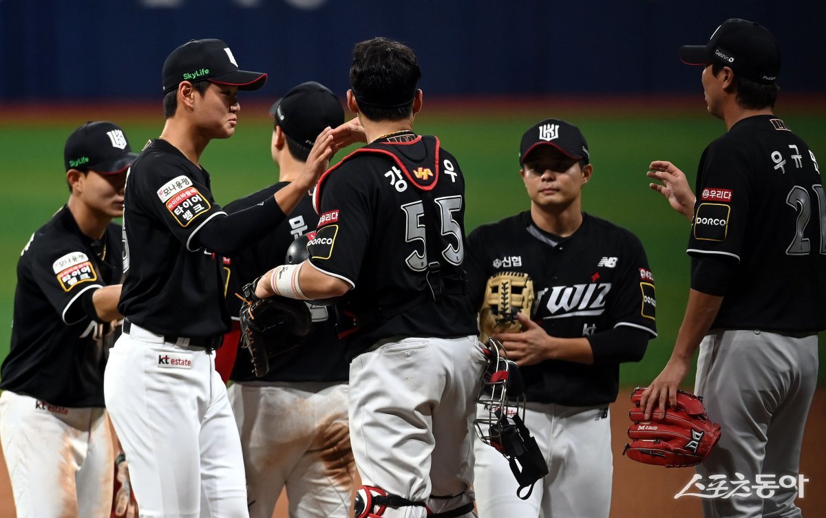17일 서울 고척스카이돔에서 ‘2024 신한 SOL 뱅크 KBO리그’ 키움 히어로즈와 KT 위즈의 경기가 열렸다. KT가 키움을 상대로 9-2 승리를 거둔 후 선수들이 그라운드에서 기쁨을 나누고 있다. 고척 | 김민성 기자 marineboy@donga.com