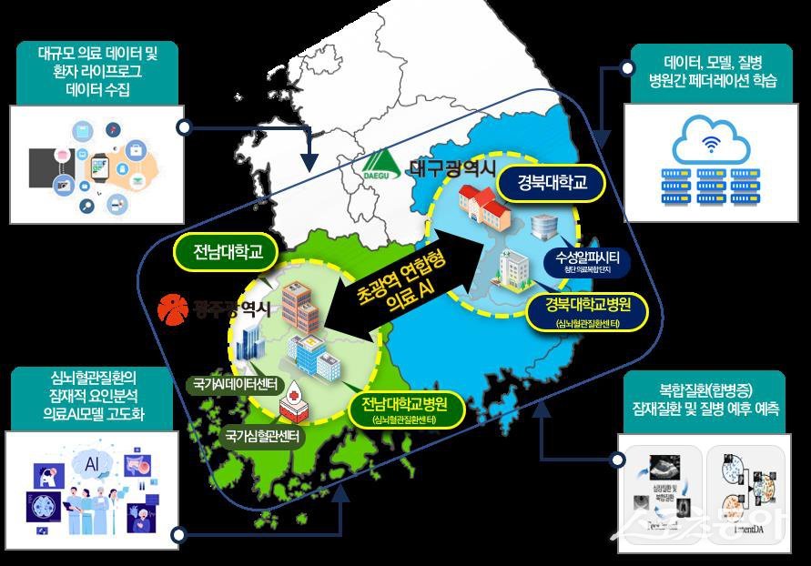 특히, 영호남을 대표하는 대학과 병원인 전남대, 경북대, 전남대병원, 경북대병원이 함께 연간 40여 명의 석·박사생을 양성하는 한편, 심뇌혈관질환의 예방·진단·치료기술을 개발하고, 잠재된 복합질환 예후를 예측할 수 있는 ‘초광역 연합 의료 AI 기술 개발’에 머리를 맞댄다.