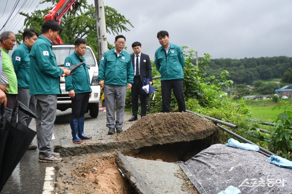 집중호우로 인한 도로 유실 현장을 찾은 강 시장은 여러 비 피해의 원인을 면밀히 검토하고 피해 최소화 및 시민 안전 확보를 최우선으로 재해예방 및 복구에 나설 것을 지시했다.