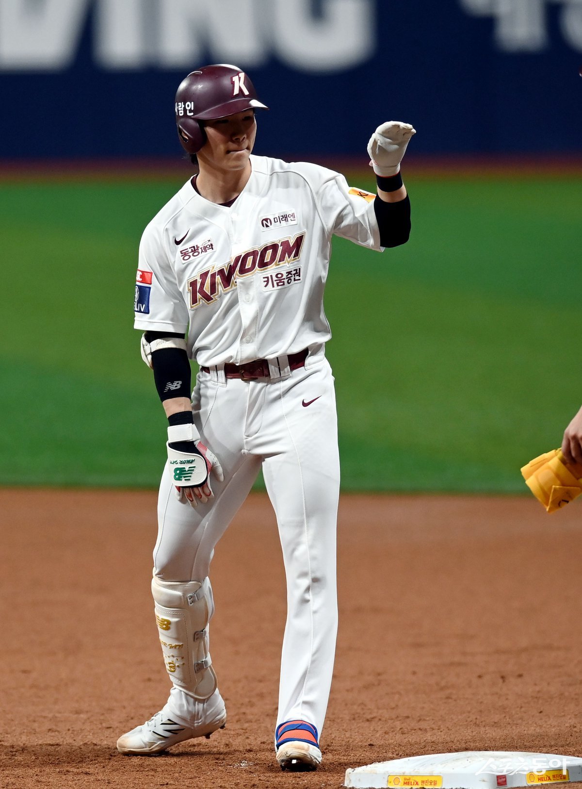 18일 서울 고척스카이돔에서 ‘2024 신한 SOL 뱅크 KBO리그’ 키움 히어로즈와 KT 위즈의 경기가 열렸다. 1회말 무사 1, 3루에서 키움 김혜성이 1타점 적시타를 날린 후 세리머니를 펼치고 있다. 고척 | 김민성 기자 marineboy@donga.com