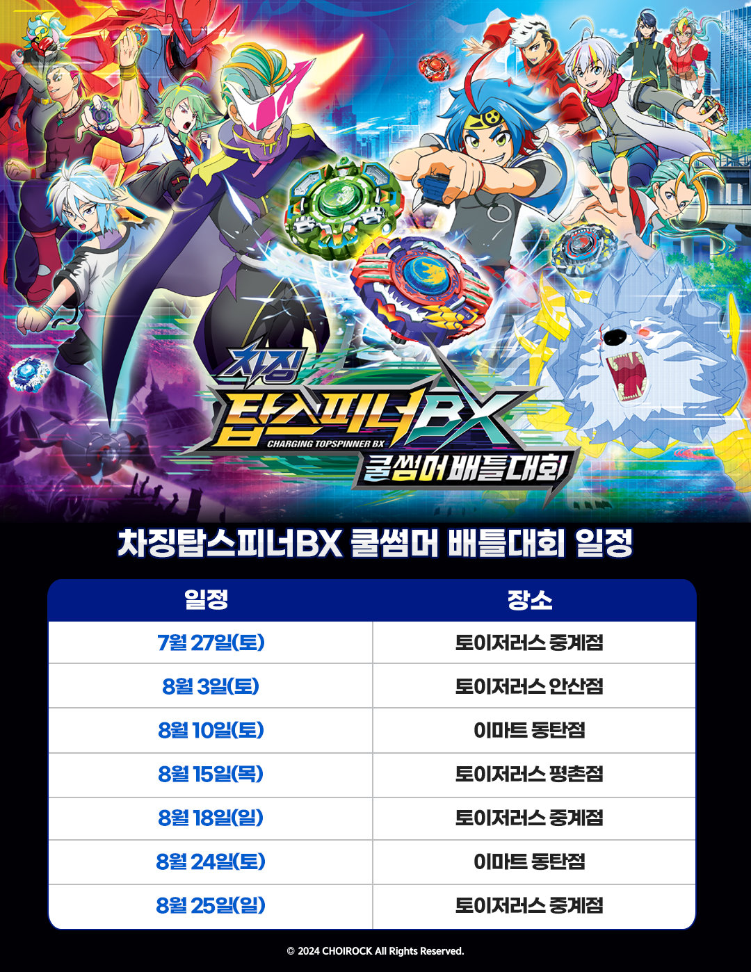7, 8월 주말마다 서울 및 수도권 대형마트를 돌며 차징 탑스피너BX 팽이 배틀의 우승자를 가린다. 장소는 토이저러스 중계점(7월 27일, 8월 18, 25일), 안산점(8월 3일), 평촌점(8월 15일), 이마트 동탄점(8월 10, 24일) 등이다.