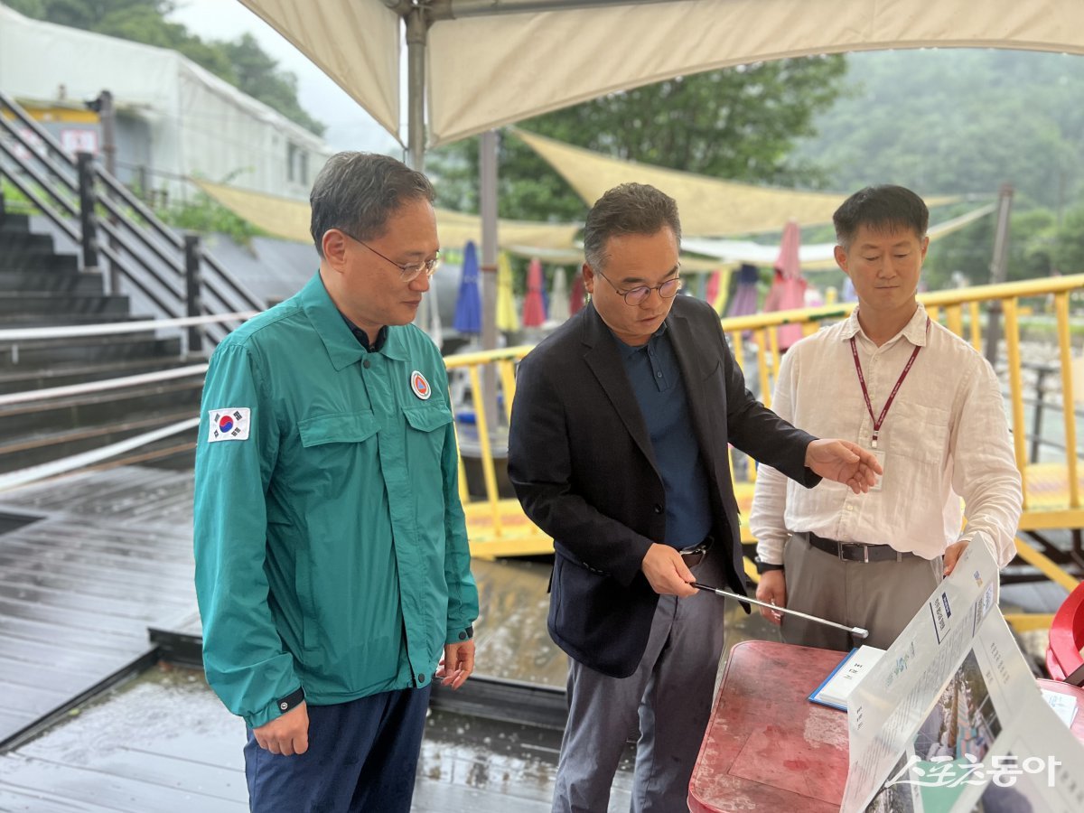 김종훈 포천시 부시장(윈쪽)이 지난 22일 집중호우 대비 시설 안전 점검을 위해 주요 사업장의 현장을 살펴보고 있다. 사진제공ㅣ포천시