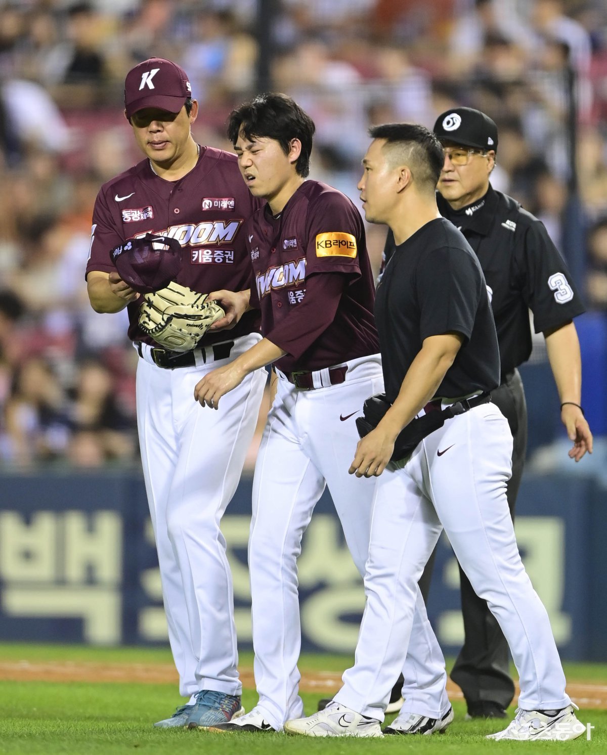 24일 서울 잠실야구장에서 열린 ‘2024 신한 SOL 뱅크 KBO리그’ 키움 히어로즈와 두산 베어스의 경기에서 5회말 1사 두산의 강습 타구에 다리를 맞은 키움 하영민이 통증을 호소하고 있다. 잠실 | 주현희 기자 teth1147@donga.com