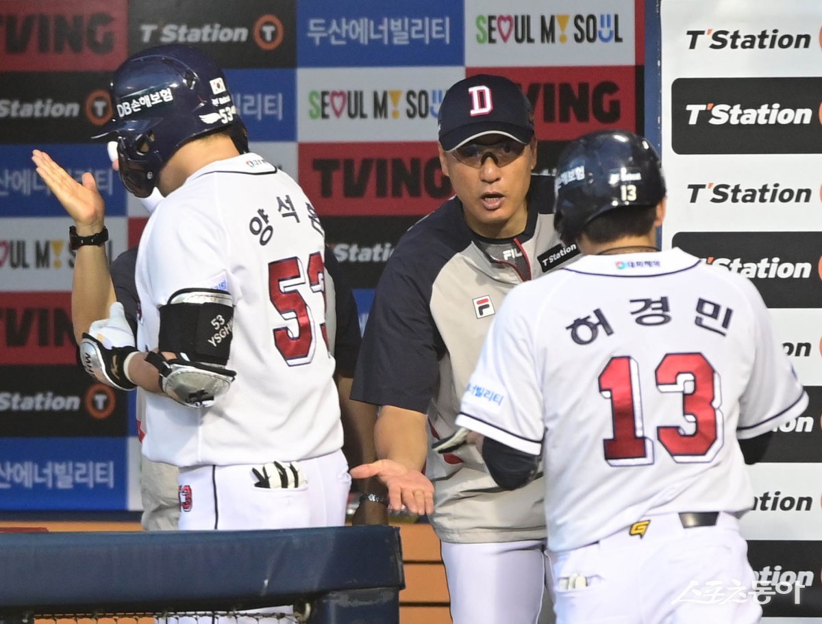 24일 서울 잠실야구장에서 열린 ‘2024 신한 SOL 뱅크 KBO리그’ 키움 히어로즈와 두산 베어스의 경기에서 4회말 1사 1루 두산 양석환이 동점 2점 홈런을 친 후 이승엽 감독의 축하를 받고 있다. 잠실 | 주현희 기자 teth1147@donga.com