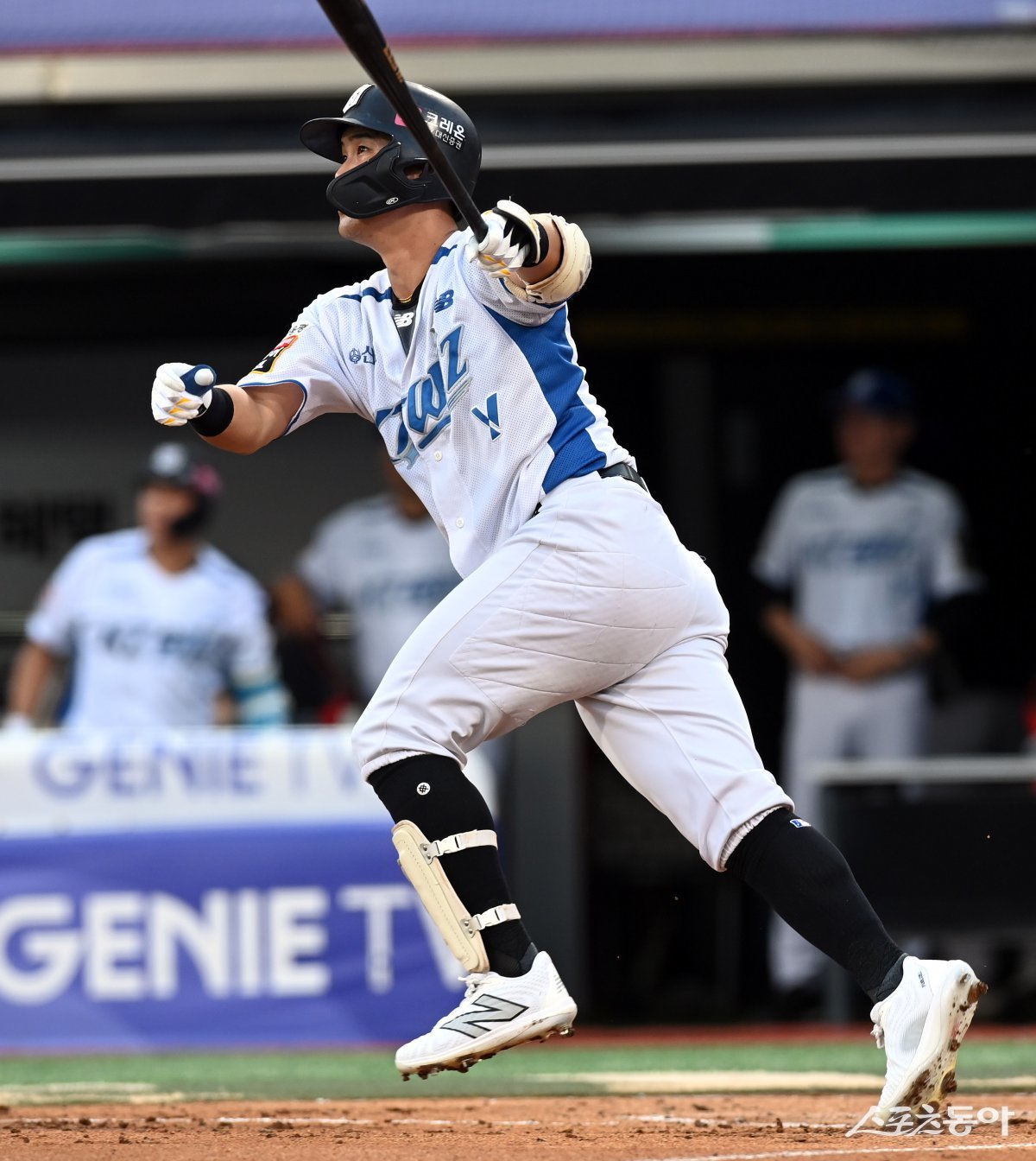 24일 경기도 수원 KT위즈파크에서 ‘2024 신한 SOL 뱅크 KBO리그’ KT 위즈와 SSG 랜더스의 경기가 열렸다. 2회말 무사 1루에서 KT 배정대가 1타점 2루타를 날리고 있다. 수원 | 김민성 기자 marineboy@donga.com