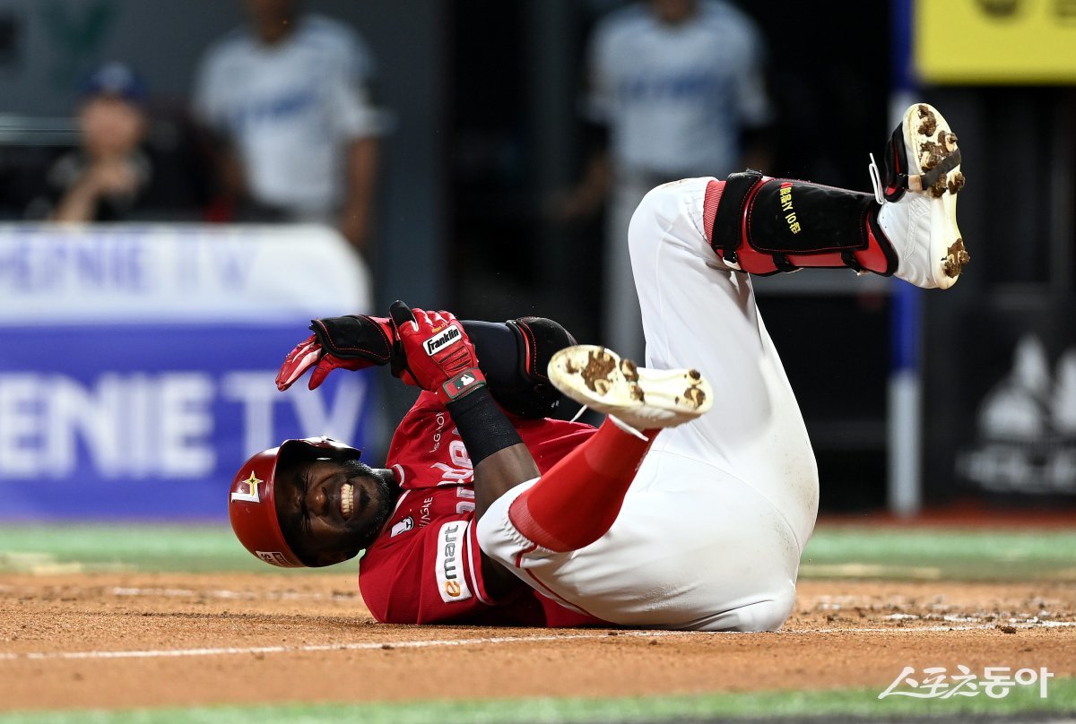 24일 경기도 수원 KT위즈파크에서 ‘2024 신한 SOL 뱅크 KBO리그’ KT 위즈와 SSG 랜더스의 경기가 열렸다. 6회초 무사 1, 2루에서 SSG 에레디아가 투구에 맞은 후 고통을 호소하고 있다. 수원 | 김민성 기자 marineboy@donga.com