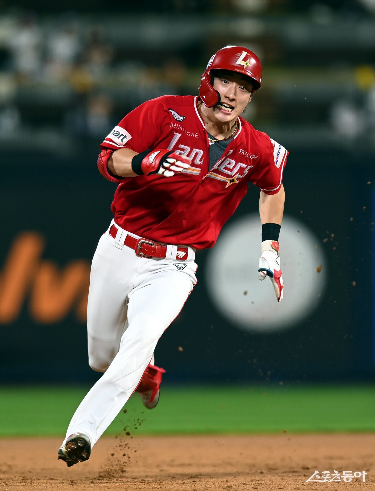 24일 경기도 수원 KT위즈파크에서 ‘2024 신한 SOL 뱅크 KBO리그’ KT 위즈와 SSG 랜더스의 경기가 열렸다. 7회초 1사 1루에서 SSG 최지훈이 1타점 3루타를 날린 후 그라운드를 질주하고 있다. 수원 | 김민성 기자 marineboy@donga.com