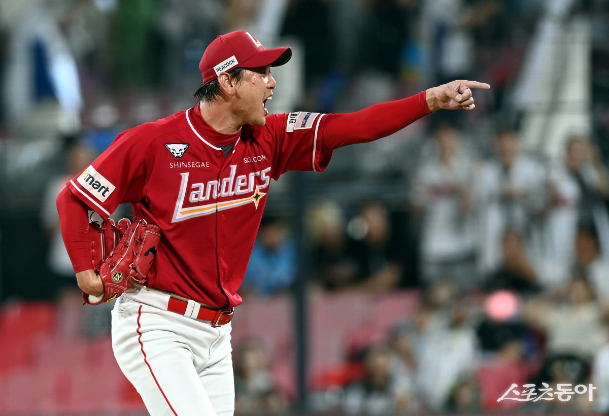 24일 경기도 수원 KT위즈파크에서 ‘2024 신한 SOL 뱅크 KBO리그’ KT 위즈와 SSG 랜더스의 경기가 열렸다. 6회말 2사에서 SSG 선발 김광현이 배트가 돌았다며 손짓하고 있다. 수원 | 김민성 기자 marineboy@donga.com