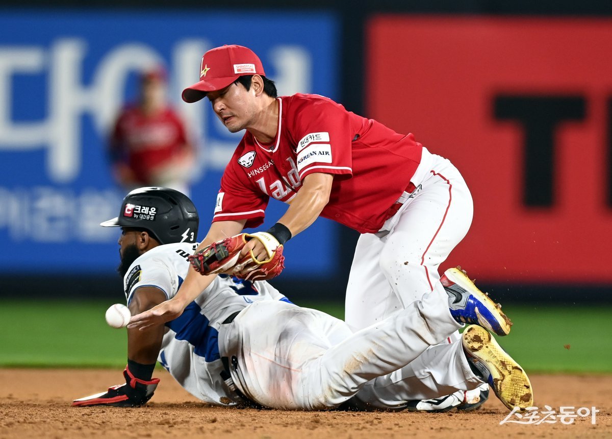 24일 경기도 수원 KT위즈파크에서 ‘2024 신한 SOL 뱅크 KBO리그’ KT 위즈와 SSG 랜더스의 경기가 열렸다. 7회말 1사 1, 2루에서 SSG 김성현이 견제구를 놓치고 있다. 수원 | 김민성 기자 marineboy@donga.com
