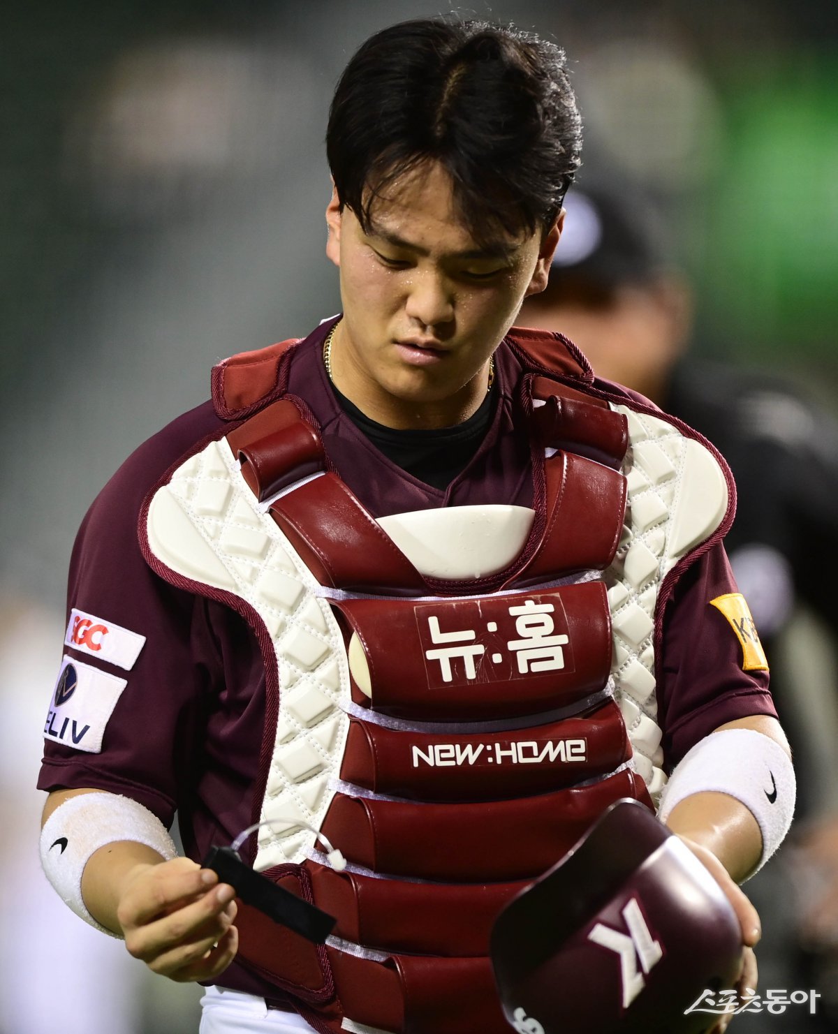 24일 서울 잠실야구장에서 열린 ‘2024 신한 SOL 뱅크 KBO리그’ 키움 히어로즈와 두산 베어스의 경기에서 7회말 시작에 앞서 키움 김건희가 피치컴 송신기를 빼고 있다. 잠실 | 주현희 기자 teth1147@donga.com