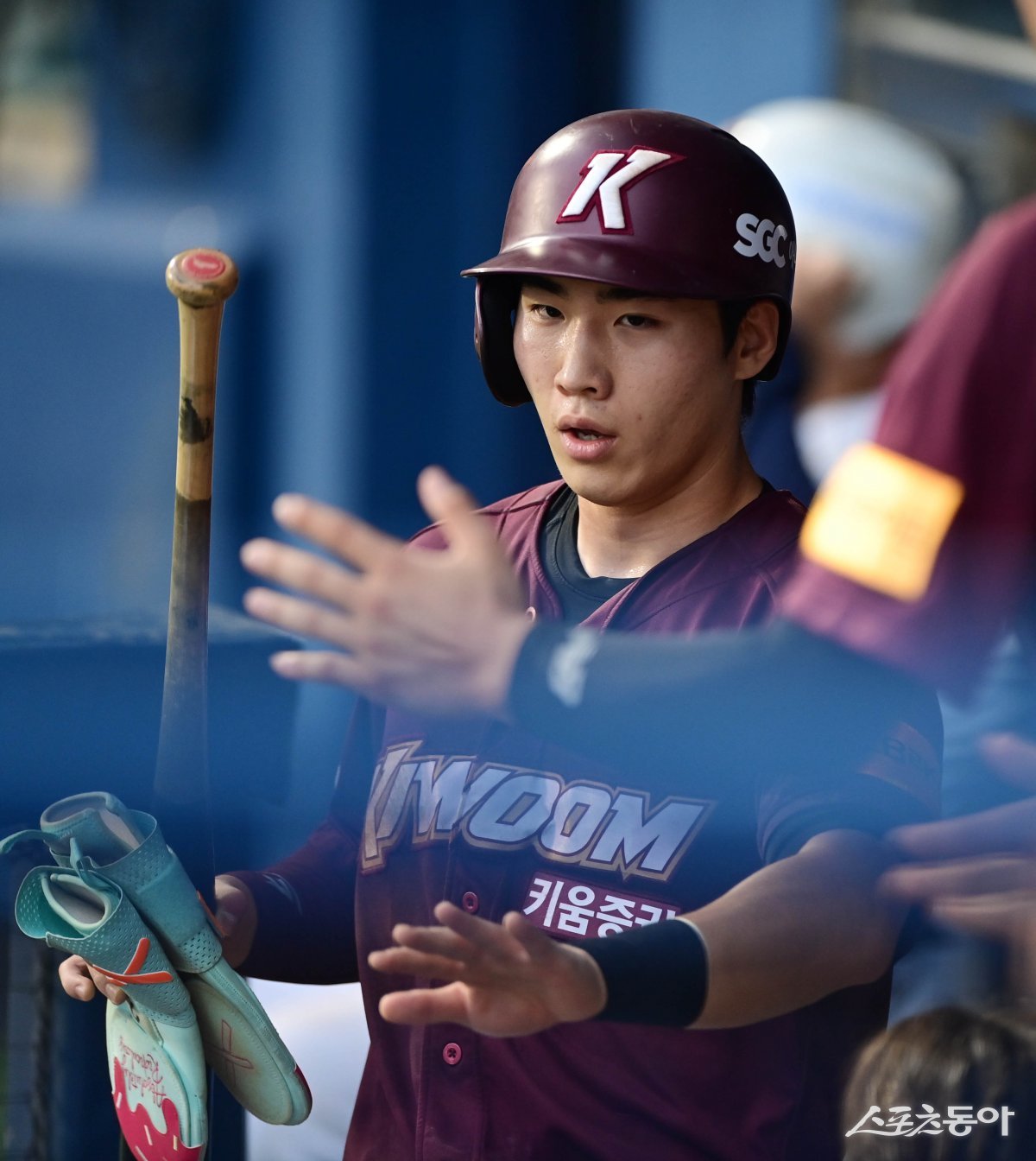 25일 서울 잠실야구장에서 열린 ‘2024 신한 SOL 뱅크 KBO리그’ 키움 히어로즈와 두산 베어스의 경기에서 4회초 무사 1, 2루 키움의 적시타 때 득점에 성공한 2루주자 이주형이 동료들과 기쁨을 나누고 있다. 잠실 | 주현희 기자 teth1147@donga.com