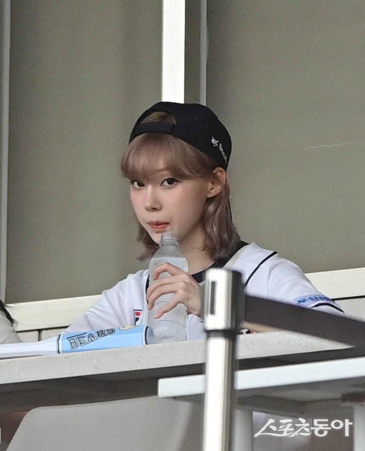 25일 서울 잠실야구장에서 열린 ‘2024 신한 SOL 뱅크 KBO리그’ 키움 히어로즈와 두산 베어스의 경기에서 시구를 마친 에스파 윈터가 물을 마시고 있다. 잠실 | 주현희 기자 teth1147@donga.com