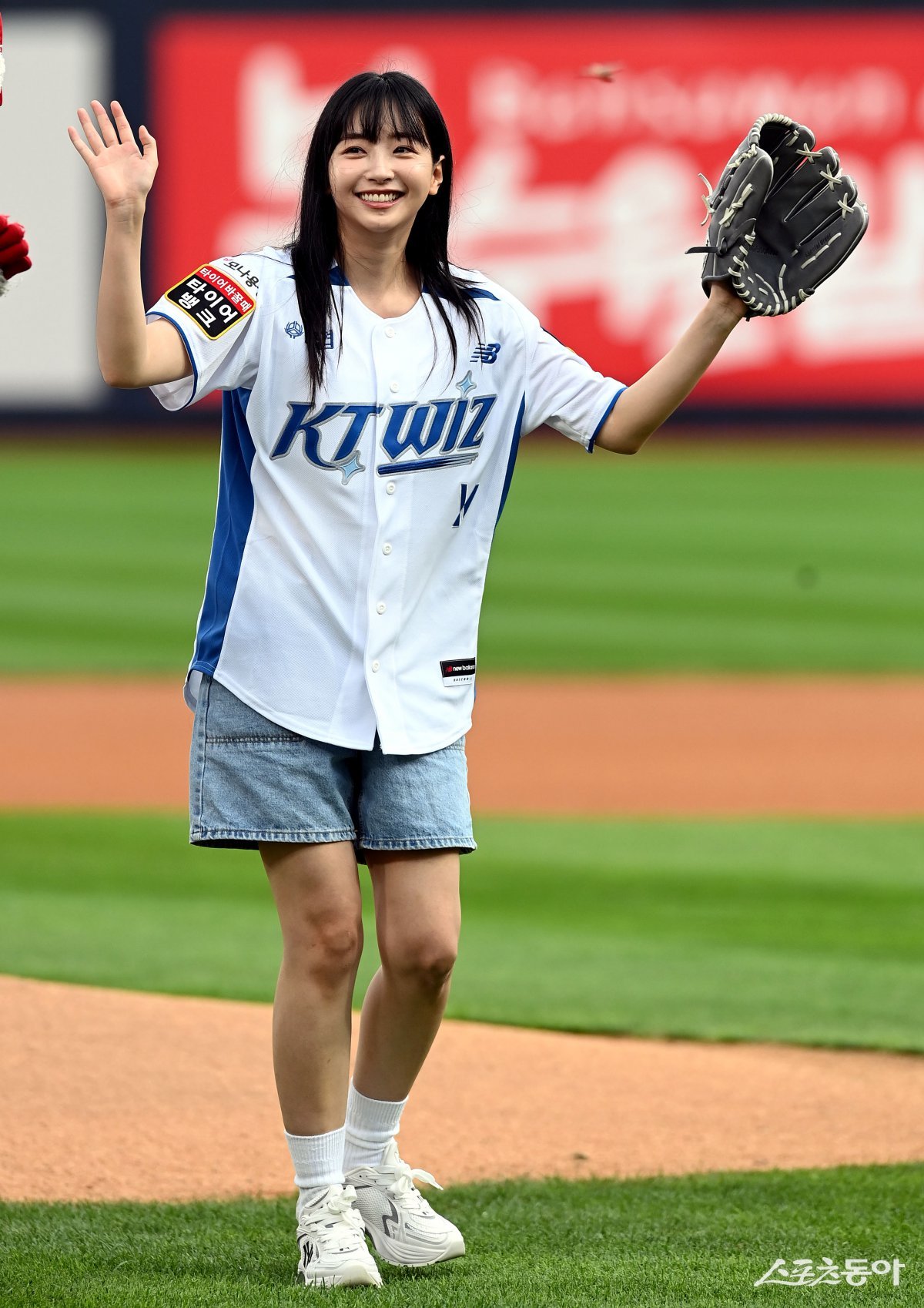 25일 경기도 수원 KT위즈파크에서 ‘2024 신한 SOL 뱅크 KBO리그’ KT 위즈와 SSG 랜더스의 경기가 열렸다. 배우 권아름이 KT 승리기원 시구 후 미소를 짓고 있다. 수원 | 김민성 기자 marineboy@donga.com