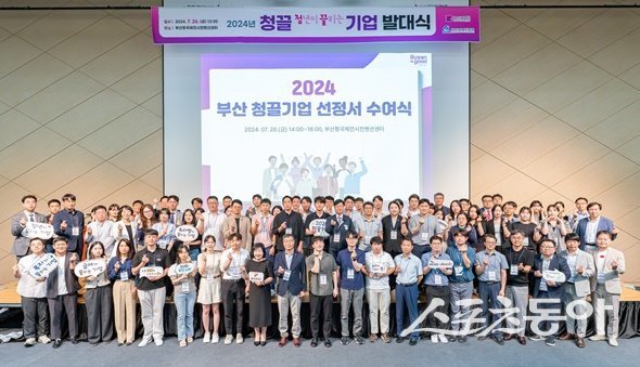 부산시가 2024년 청끌기업 100개사를 선정한 가운데 지난 26일 부산항국제전시컨벤션센터에서 열린 청끌기업 선정서 수여식에 참여한 관계자들이 기념촬영을 하고 있다. (사진제공=부산시)