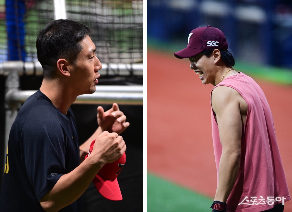 28일 서울 고척스카이돔에서 열린 ‘2024 신한 SOL 뱅크 KBO리그’ KIA 타이거즈와 키움 히어로즈의 경기에 앞서 KIA 서건창이 키움 송성문에게 장난을 치고 있다. 고척 | 주현희 기자 teth1147@donga.com