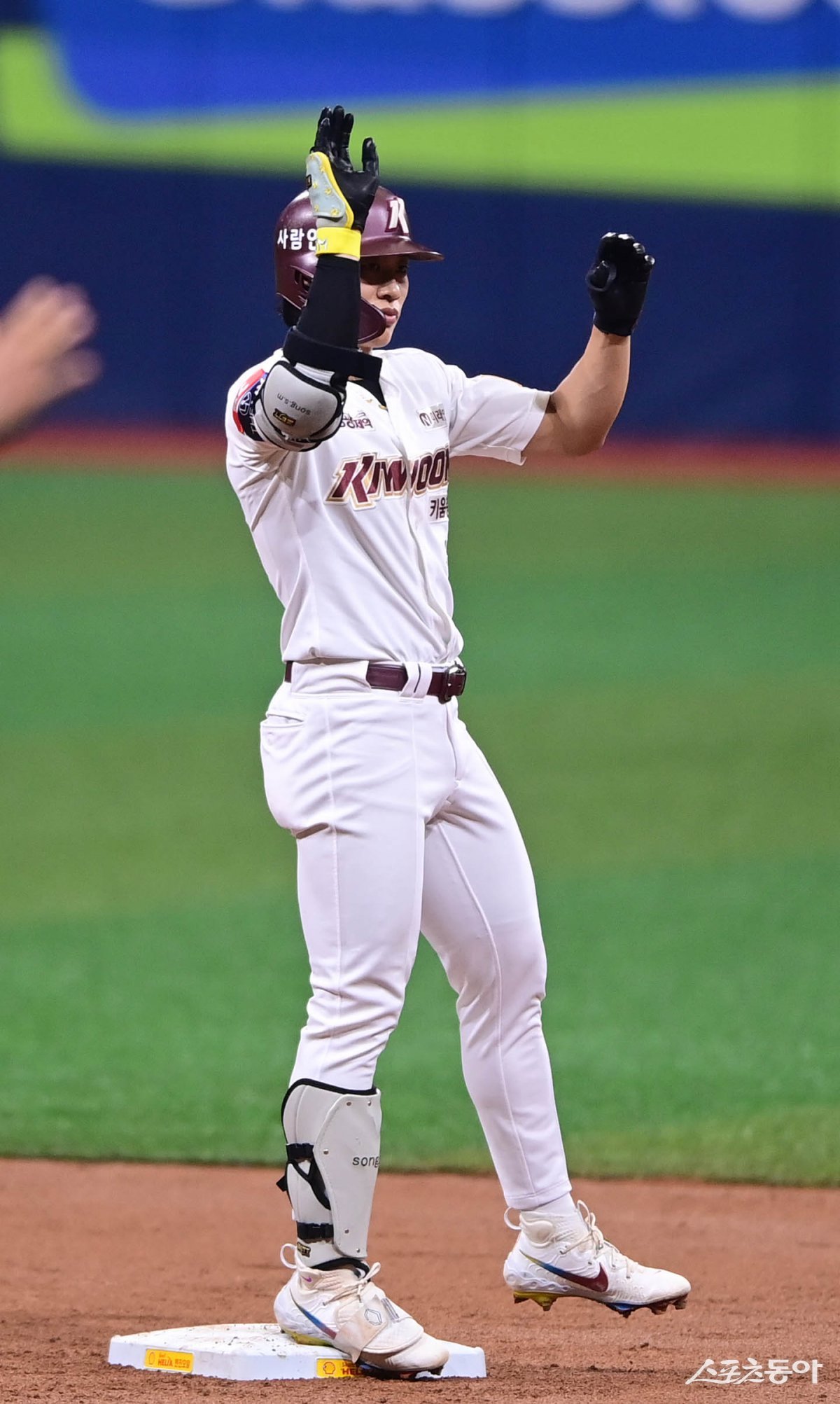 28일 서울 고척스카이돔에서 열린 ‘2024 신한 SOL 뱅크 KBO리그’ KIA 타이거즈와 키움 히어로즈의 경기에서 1회말 1사 1루 키움 송성문이 선제 1타점 우전 2루타를 친 후 세리머니를 하고 있다. 고척 | 주현희 기자 teth1147@donga.com