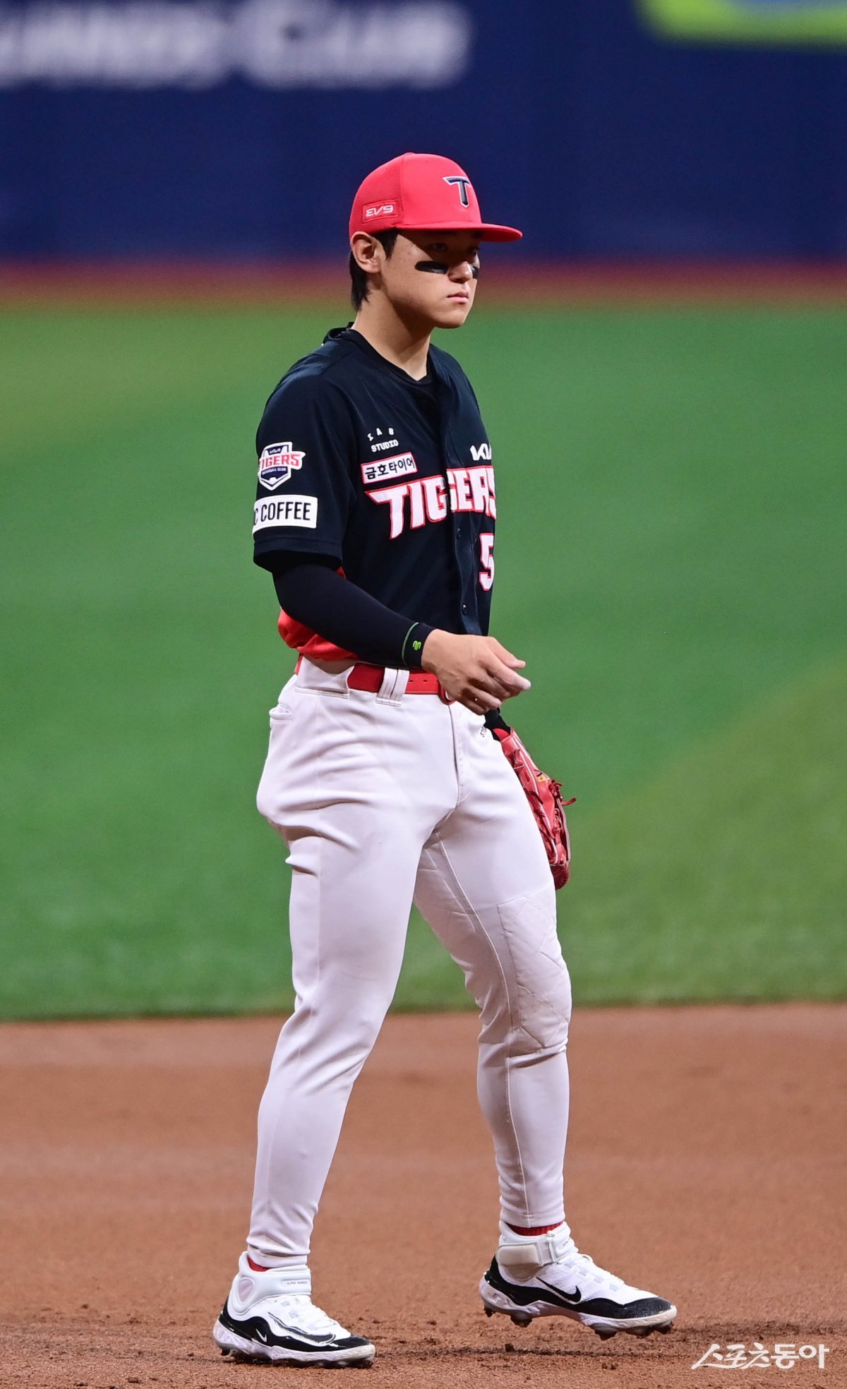 28일 서울 고척스카이돔에서 열린 ‘2024 신한 SOL 뱅크 KBO리그’ KIA 타이거즈와 키움 히어로즈의 경기에서 1회말 무사 키움의 땅볼 타구를 놓친 KIA 3루수 김도영이 아쉬워하고 있다. 고척 | 주현희 기자 teth1147@donga.com