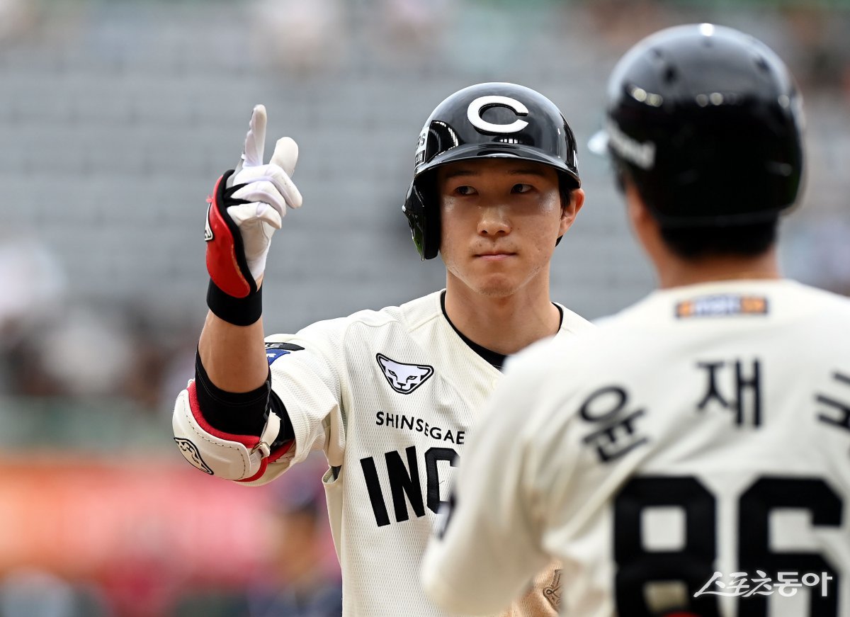 28일 인천 SSG 랜더스필드에서 ‘2024 신한 SOL 뱅크 KBO리그’ SSG 랜더스와 두산 베어스의 경기가 열렸다. 4회말 1사 1, 3루에서 SSG 박성한이 1타점 적시타를 날린 후 세리머니를 펼치고 있다. 인천 | 김민성 기자 marineboy@donga.com