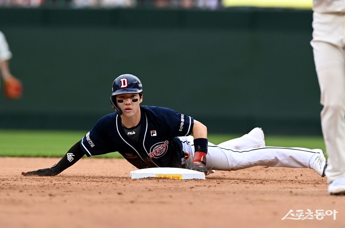 28일 인천 SSG 랜더스필드에서 ‘2024 신한 SOL 뱅크 KBO리그’ SSG 랜더스와 두산 베어스의 경기가 열렸다. 5회초 1사 1, 3루에서 두산 조수행이 2루 도루를 성공하고 있다. 인천 | 김민성 기자 marineboy@donga.com