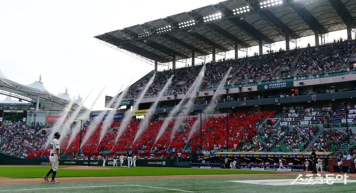 28일 인천 SSG 랜더스필드에서 ‘2024 신한 SOL 뱅크 KBO리그’ SSG 랜더스와 두산 베어스의 경기가 열렸다. 워터페스티벌 행사로 관중석을 향해 시원한 물대포가 발사되고 있다. 인천 | 김민성 기자 marineboy@donga.com