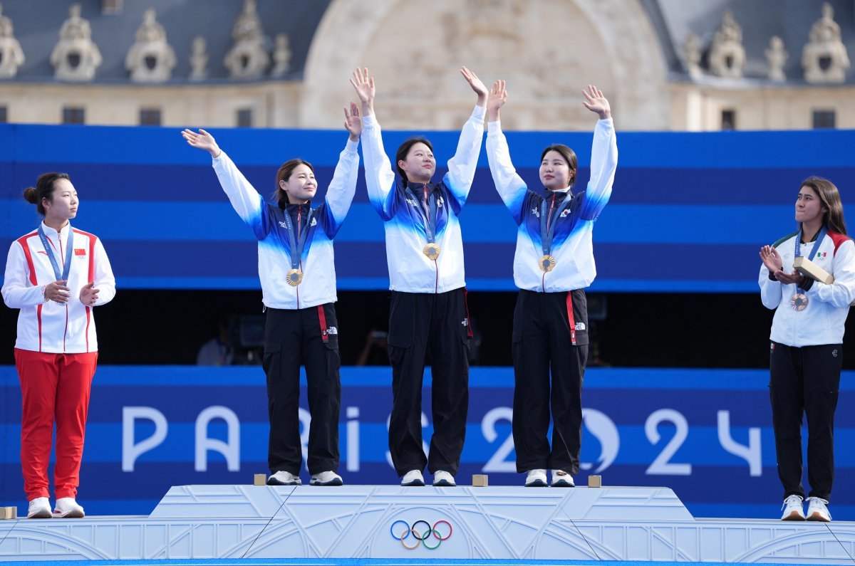 전훈영, 임시현, 남수현(왼쪽 2번째부터 4번째까지)이 29일(한국시간) 레쟁발리드양궁장에서 열린 중국과 2024파리올림픽 양궁 여자단체전 결승에서 승리한 뒤 시상대에 올라 환호에 답하고 있다. 파리|신화뉴시스