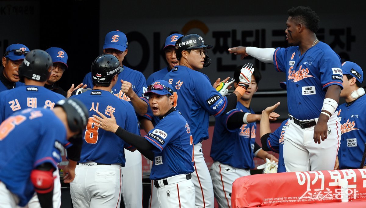 1일 경기도 수원 KT위즈파크에서 ‘2024 신한 SOL 뱅크 KBO리그’ KT 위즈와 한화 이글스의 경기가 열렸다. 1회초 2사 1, 2루에서 한화 채은성이 스리런 홈런을 쏘아 올린 후 동료의 환영을 받고 있다. 수원 | 김민성 기자 marineboy@donga.com