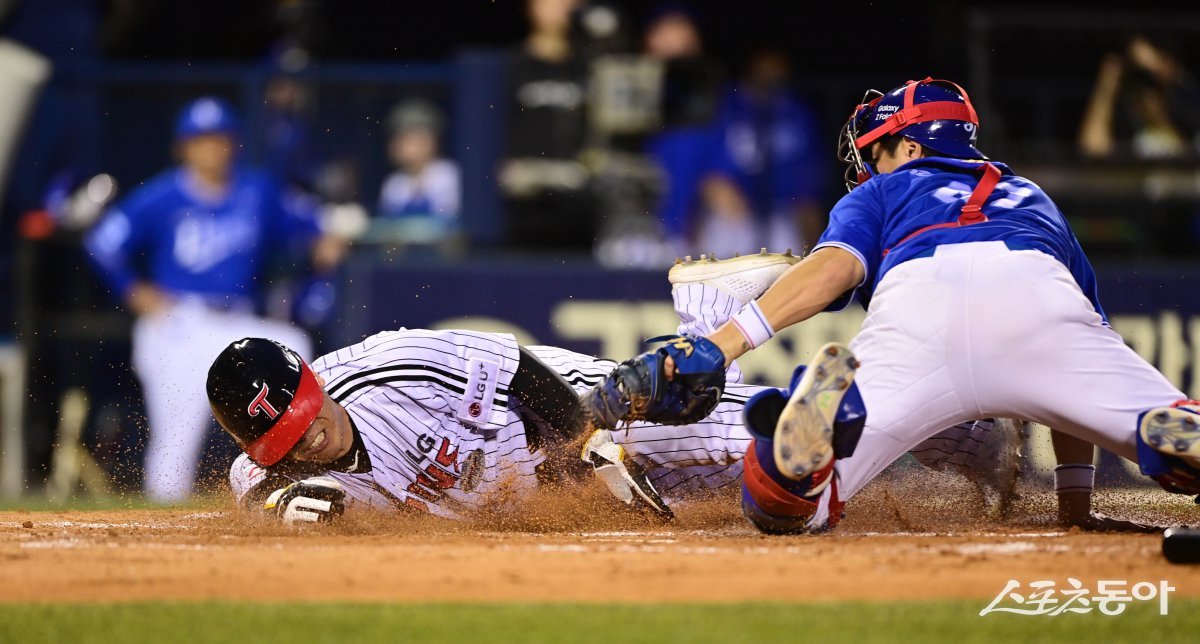 1일 서울 잠실야구장에서 열린 ‘2024 신한 SOL 뱅크 KBO리그’ 삼성 라이온즈와 LG 트윈스의 경기에서 4회말 2사 2루 LG의 내야 안타 때 2루주자 김현수가 홈으로 파고들었지만 삼성 포수에게 태그 아웃당하고 있다. 잠실 | 주현희 기자 teth1147@donga.com