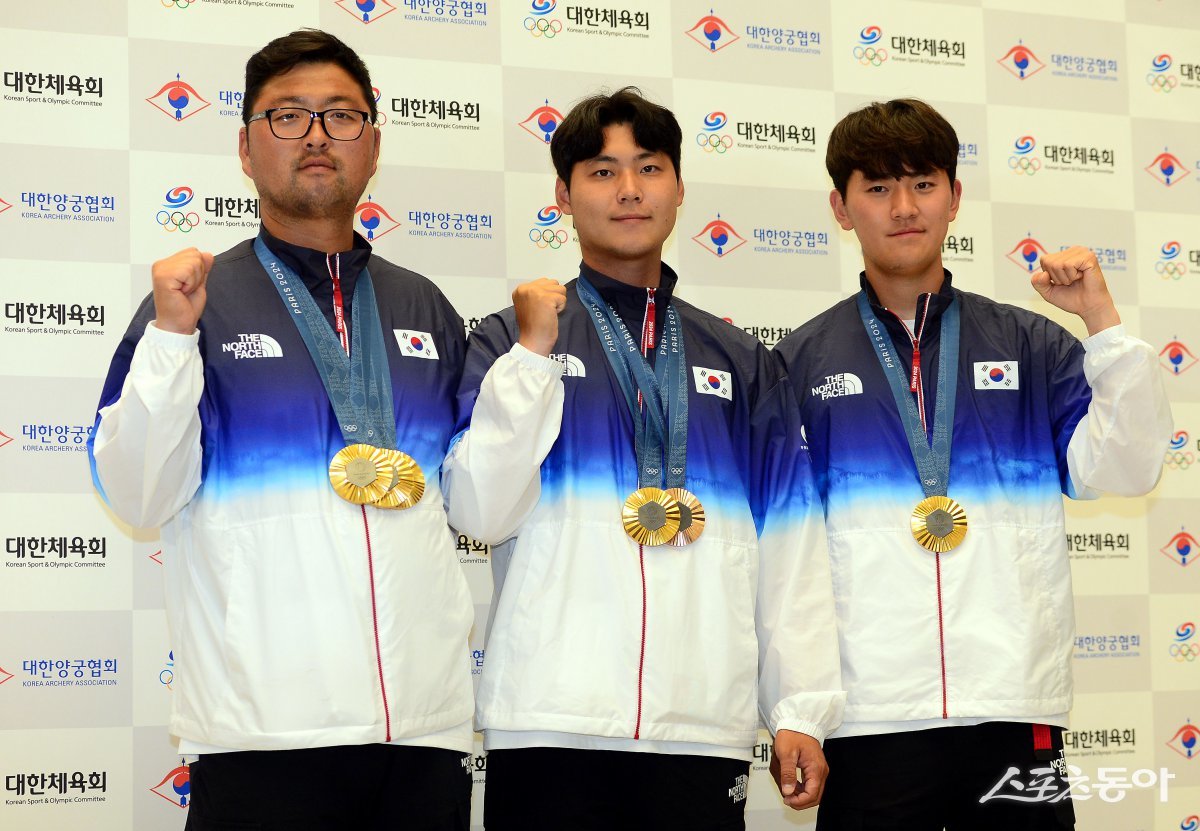 2024 파리올림픽 양궁 5개 전 종목을 석권한 대한민국 양궁 남녀 대표팀이 6일 인천공항을 통해 귀국했다. 양궁 대표팀 김우진, 이우석, 김제덕이 기념촬영을 하고 있다. 인천국제공항 | 김민성 기자 marineboy@donga.com