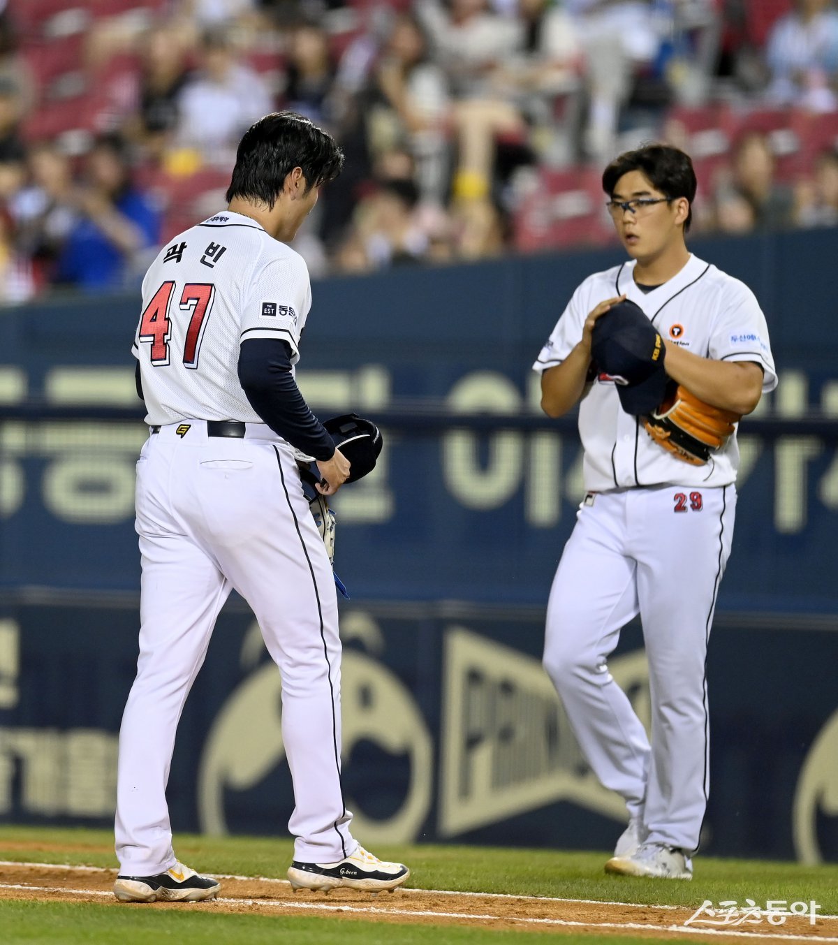 6일 서울 잠실야구장에서 ‘2024 신한은행 SOL뱅크 KBO리그’ LG 트윈스와 두산 베어스 경기가 열렸다. 선발 투수로 등판한 두산 곽빈이 5회초 1사 2루 상황에서 교체되고 있다. 잠실|김종원 기자 won@donga.com