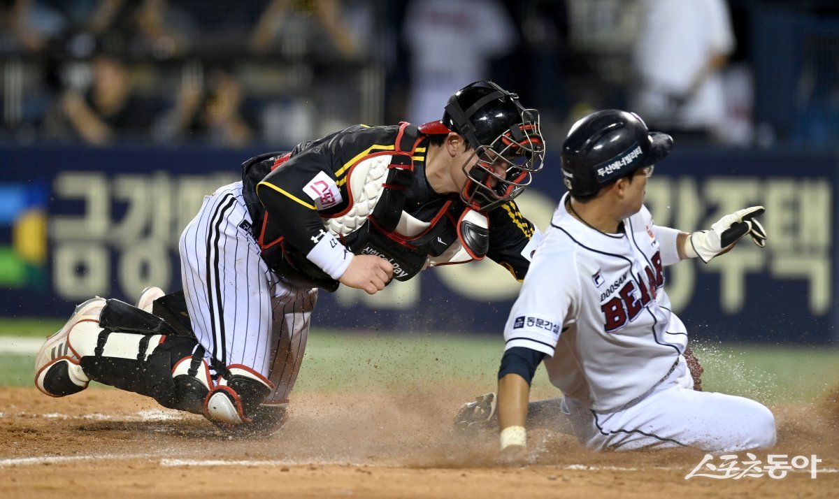 6일 서울 잠실야구장에서 ‘2024 신한은행 SOL뱅크 KBO리그’ LG 트윈스와 두산 베어스 경기가 열렸다. 4회말 2사 만루 두산 내야 땅볼 때 공이 1루로 송구되는 사이 2루주자 허경민이 홈으로 달렸으나 아웃되고 있다. 잠실|김종원 기자 won@donga.com