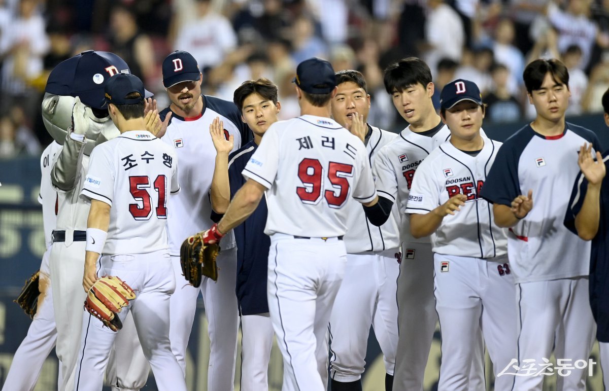 7일 서울 잠실야구장에서 ‘2024 신한은행 SOL뱅크 KBO리그’ LG 트윈스와 두산 베어스 경기가 열렸다. 8-4 승리를 거두며 위닝시리즈를 기록한 두산 선수들이 하이파이브 하고 있다. 잠실|김종원 기자 won@donga.com