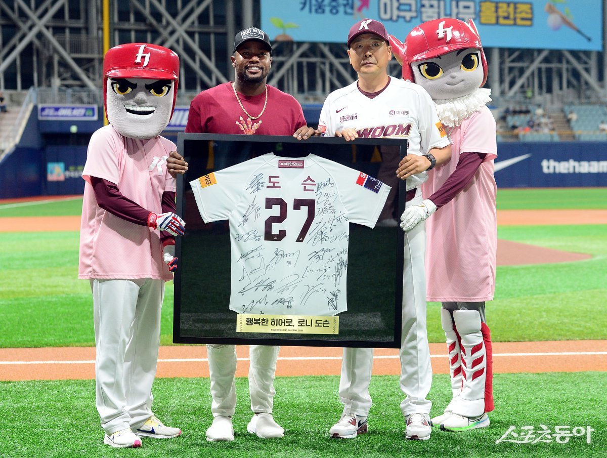 8일 서울 고척스카이돔에서 ‘2024 신한 SOL 뱅크 KBO리그’ 키움 히어로즈와 SSG 랜더스의 경기가 열렸다. 도슨 부상 회복 기원행사에서 도슨이 기념액자를 받고 홍원기 감독과 기념촬영을 하고 있다. 고척 | 김민성 기자 marineboy@donga.com
