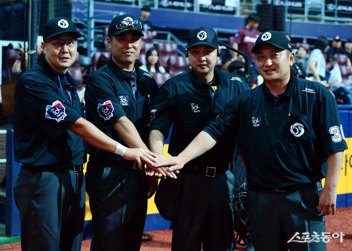 8일 서울 고척스카이돔에서 ‘2024 신한 SOL 뱅크 KBO리그’ 키움 히어로즈와 SSG 랜더스의 경기가 열렸다. 심판들이 경기에 앞서 정확한 판정을 다짐하고 있다. 고척 | 김민성 기자 marineboy@donga.com
