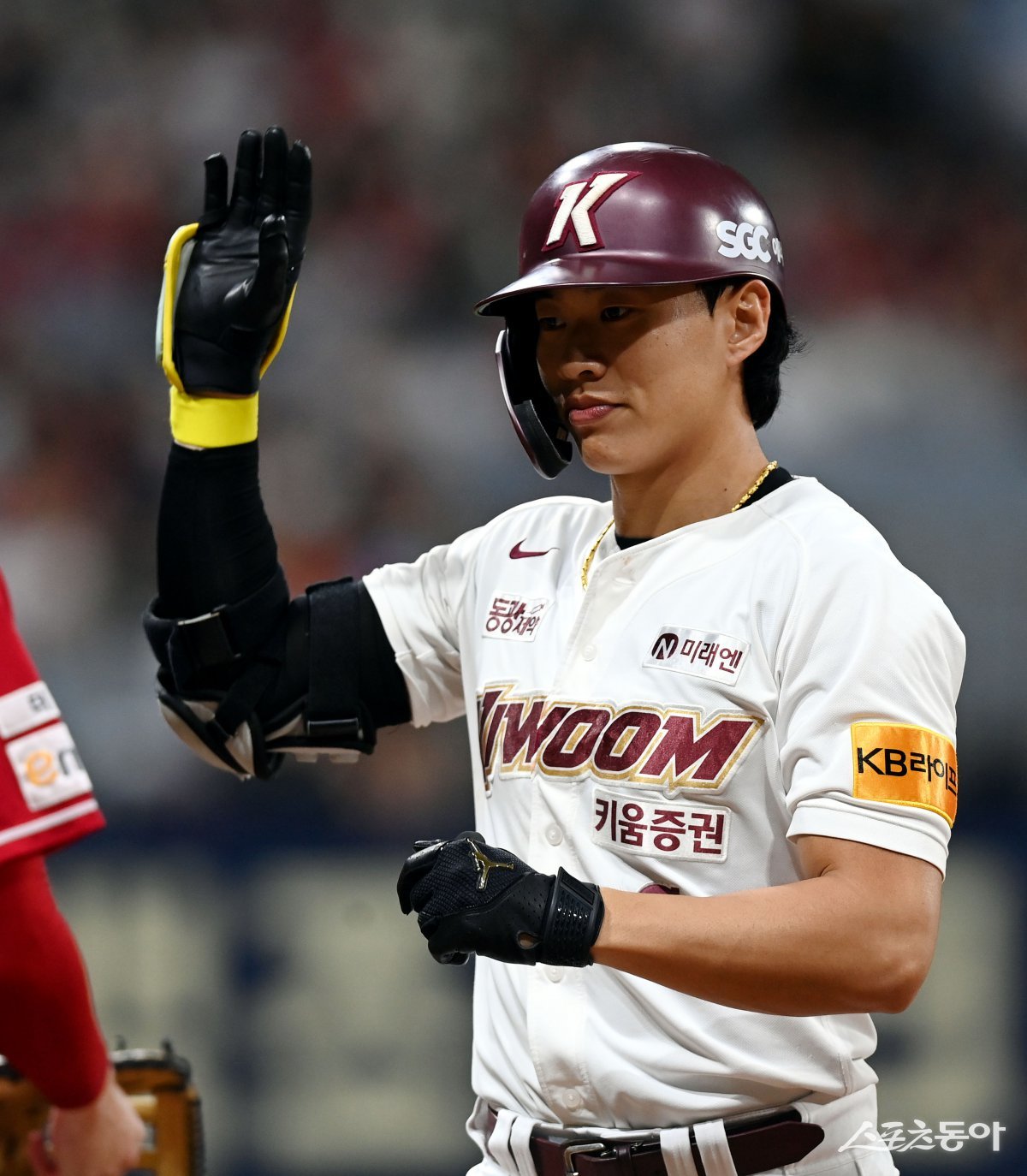 8일 서울 고척스카이돔에서 ‘2024 신한 SOL 뱅크 KBO리그’ 키움 히어로즈와 SSG 랜더스의 경기가 열렸다. 4회말 1사 2루에서 키움 송선문이 1타점 적시타를 날린 후 세리머니를 펼치고 있다. 고척 | 김민성 기자 marineboy@donga.com