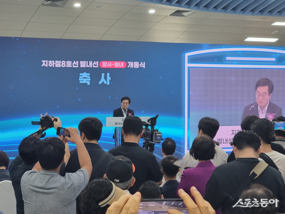 김동연 지사가 9일 오후 2시 별내역에서 열린 개통식에서 축사를 하고 있다. 사진ㅣ고성철 기자