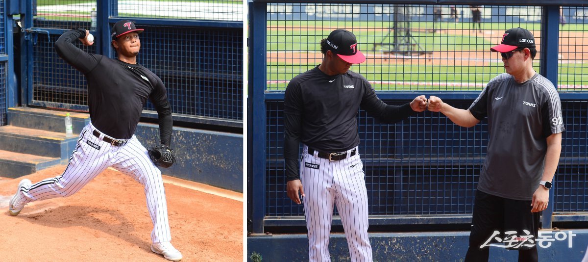11일 서울 잠실야구장에서 열린 ‘2024 신한 SOL 뱅크 KBO리그’ NC 다이노스와 LG 트윈스의 경기에 앞서 LG 에르난데스가 불펜 피칭을 마친 후 최상덕 코치와 주먹을 맞대고 있다. 잠실 | 주현희 기자 teth1147@donga.com