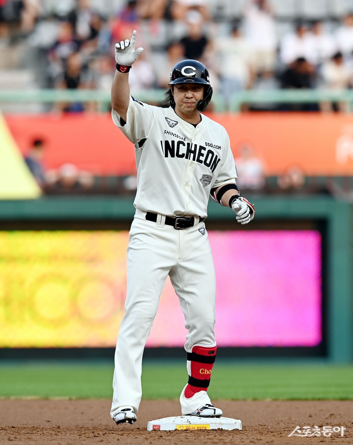 11일 인천 SSG 랜더스필드에서 ‘2024 신한 SOL 뱅크 KBO리그’ SSG 랜더스와 두산 베어스의 경기가 열렸다. 2회말 2사 1, 2루에서 SSG 최정이 2타점 2루타를 날린 후 세리머니를 펼치고 있다. 이날 2루타로 최정은 6시즌 연속 100안타를 기록했다. 인천 | 김민성 기자 marineboy@donga.com