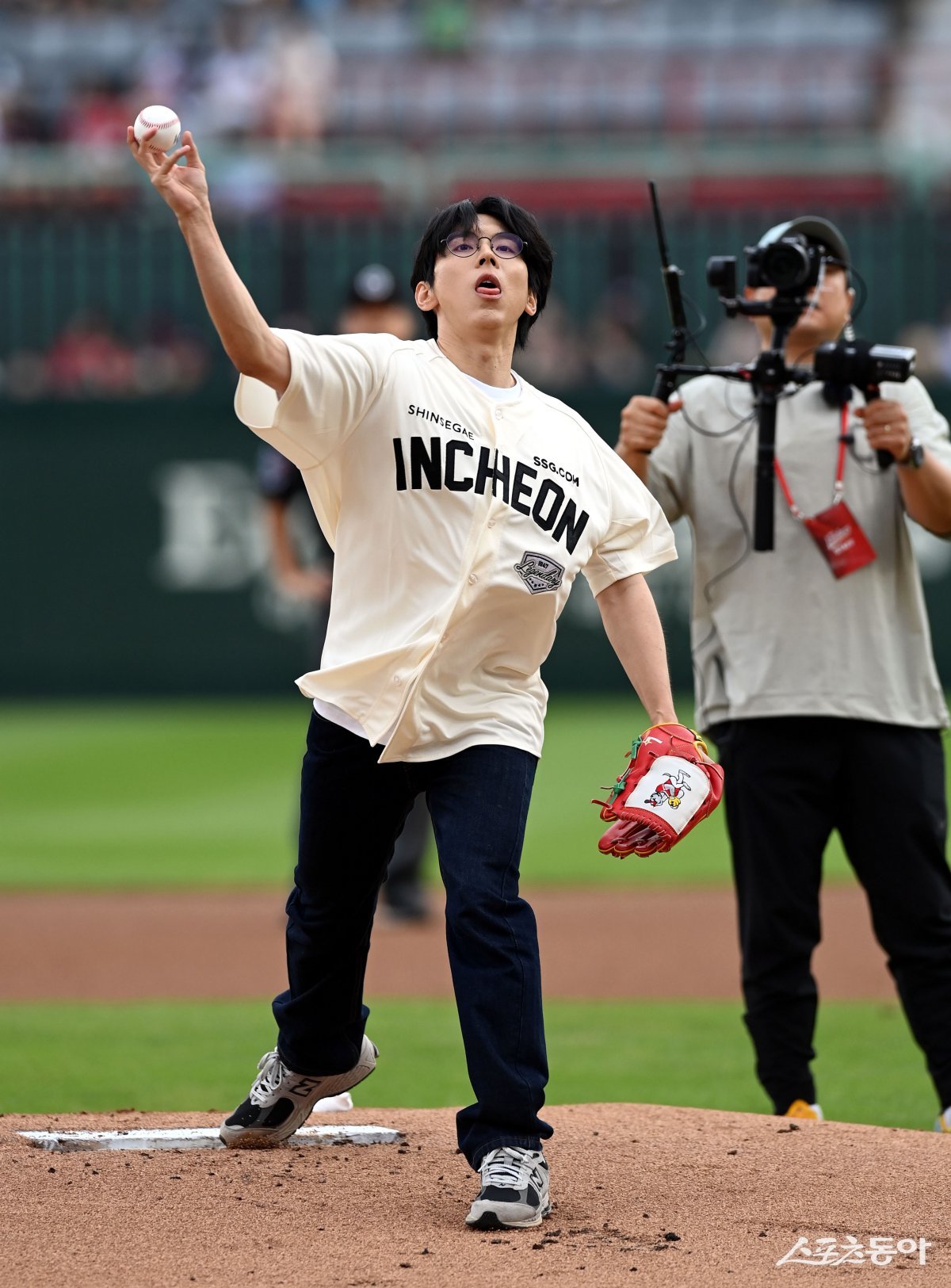 11일 인천 SSG 랜더스필드에서 ‘2024 신한 SOL 뱅크 KBO리그’ SSG 랜더스와 두산 베어스의 경기가 열렸다. 가수 홍이삭이 SSG 승리 기원 시구를 하고 있다. 인천 | 김민성 기자 marineboy@donga.com