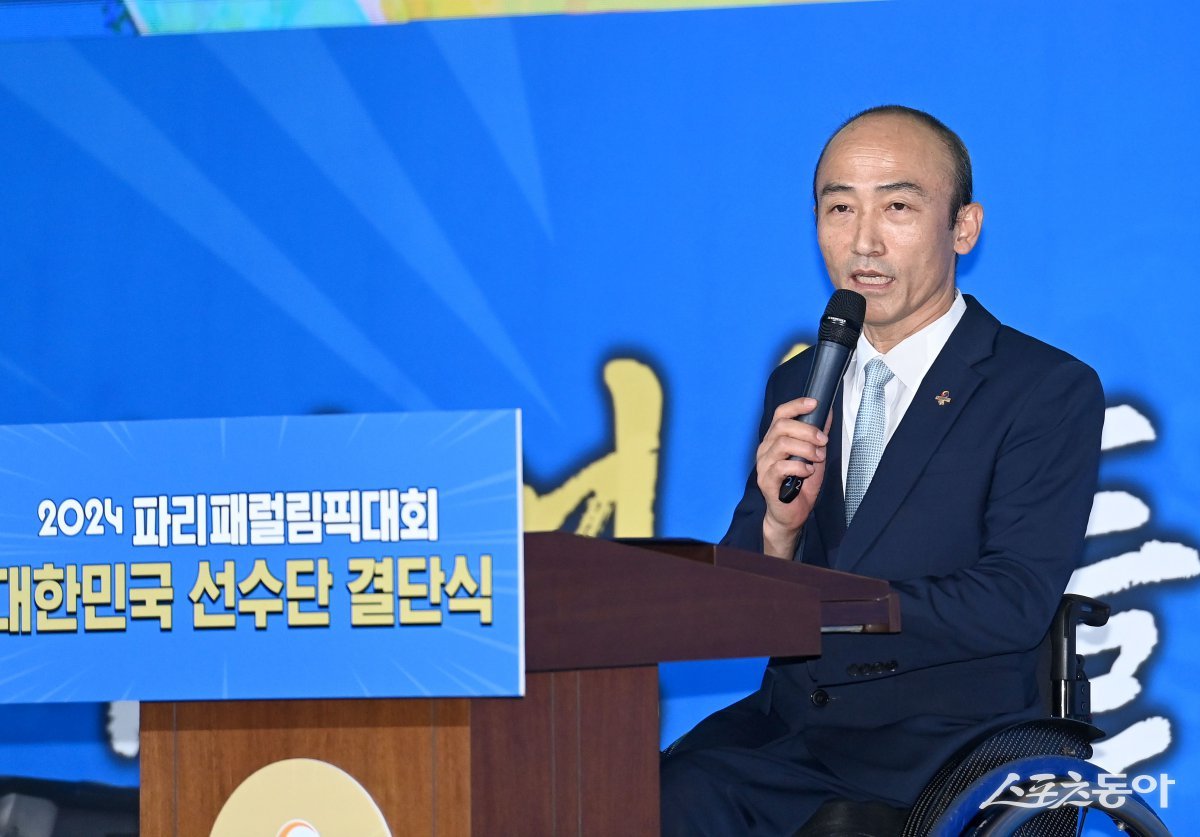 12일 서울 송파구 올림픽파크텔에서 열린 ‘2024 파리 패럴림픽 대한민국 선수단 결단식’에서 정진완 대한장애인체육회장이 개식사를 하고 있다. 김종원 기자 won@donga.com