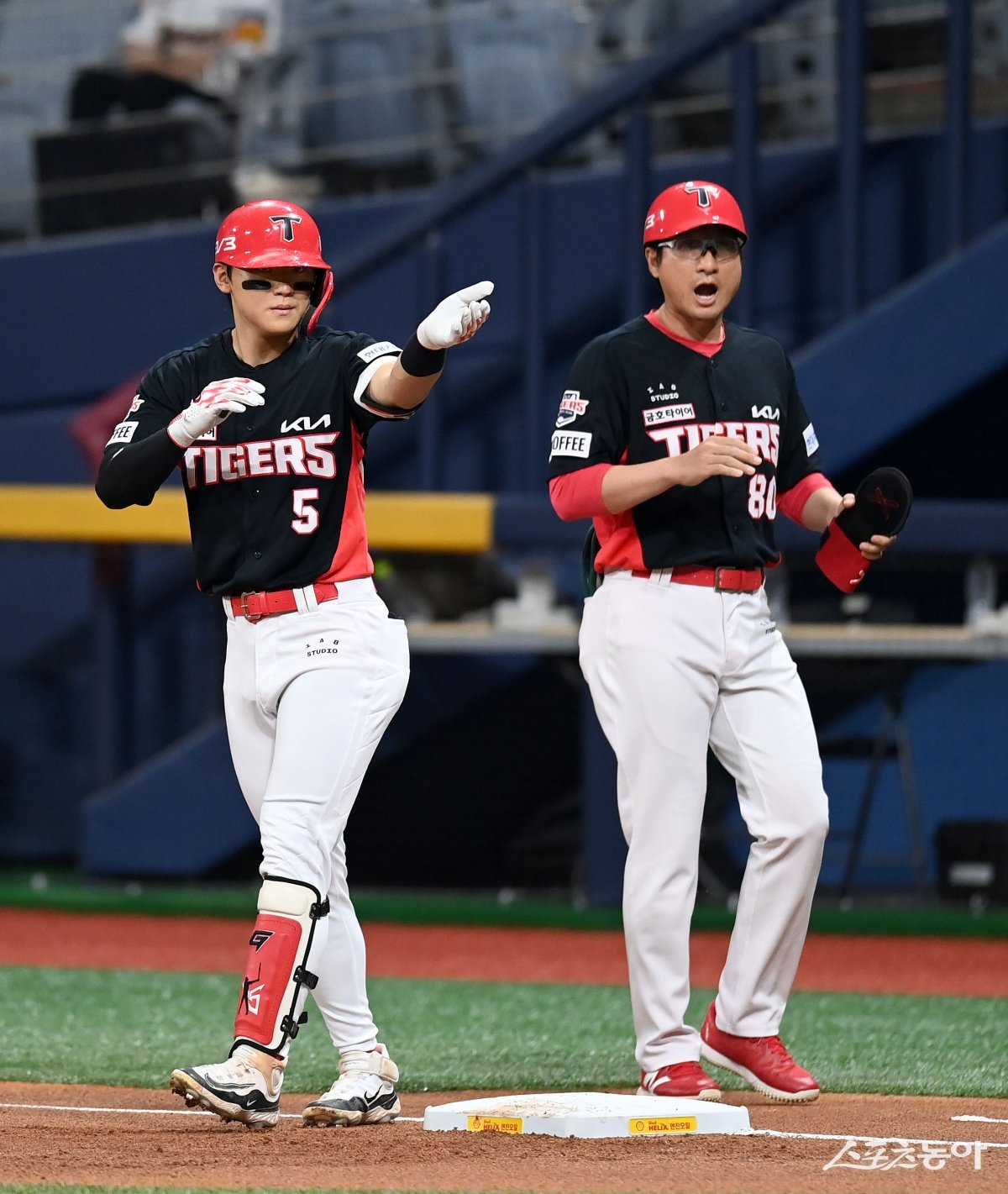 13일 서울 고척스카이돔에서 ‘2024 신한은행 SOL뱅크 KBO리그’ KIA 타이거즈와 키움 히어로즈 경기가 열렸다. 1회초 2사 KIA 김도영이 중전 안타를 치고 1루에서 기뻐하고 있다. 고척|김종원 기자 won@donga.com