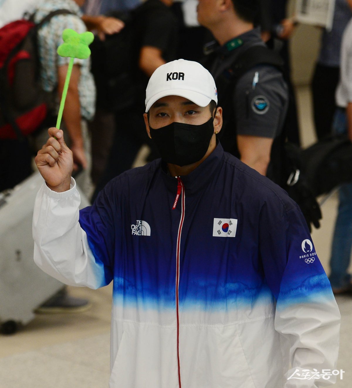 한국 올림픽 선수단들이 13일 인천국제공항 2터미널을 통해 귀국하고 있다. 브레이킹 대표팀 홍텐이 취재진을 향해 인사하고 있다. 인천국제공항 | 주현희 기자 teth1147@donga.com
