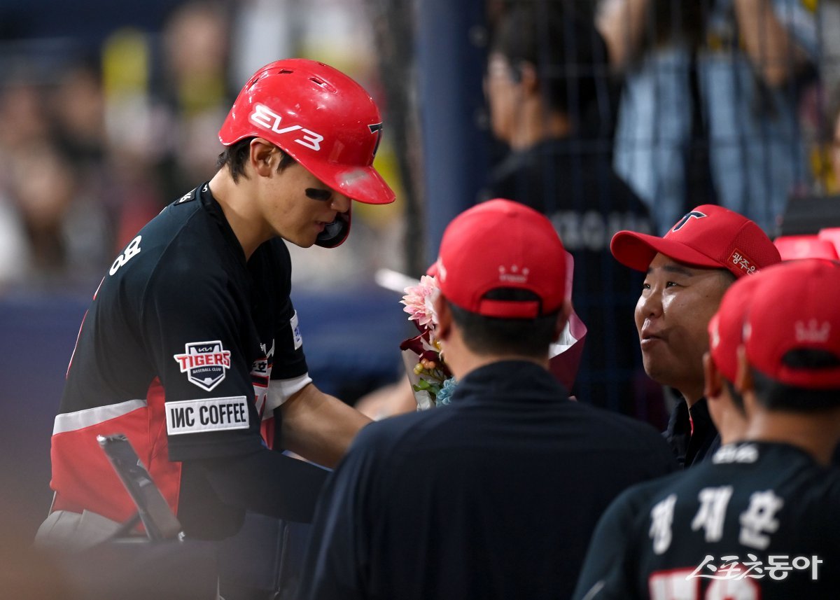 15일 서울 고척스카이돔에서 ‘2024 신한은행 SOL뱅크 KBO리그’ KIA 타이거즈와 키움 히어로즈 경기가 열렸다. 5회초 1사 1루 KIA 김도영이 중월 투런 홈런을 날리고 그라운드를 돌아 홈인해 이범호 감독에게 축하꽃다발을 받고 있다. 고척|김종원 기자 won@donga.com