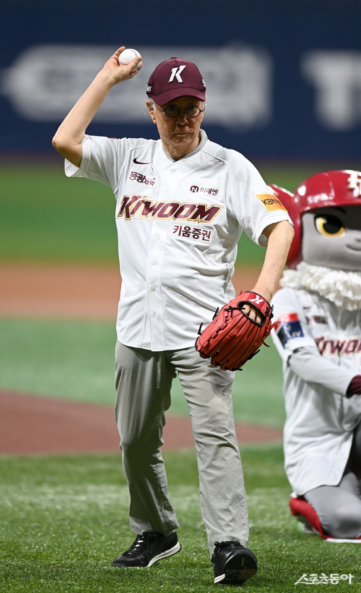 15일 서울 고척스카이돔에서 ‘2024 신한은행 SOL뱅크 KBO리그’ KIA 타이거즈와 키움 히어로즈 경기가 열렸다. 경기 전 독립유공자 후손 민영백 씨가 시구를 하고 있다. 고척|김종원 기자 won@donga.com