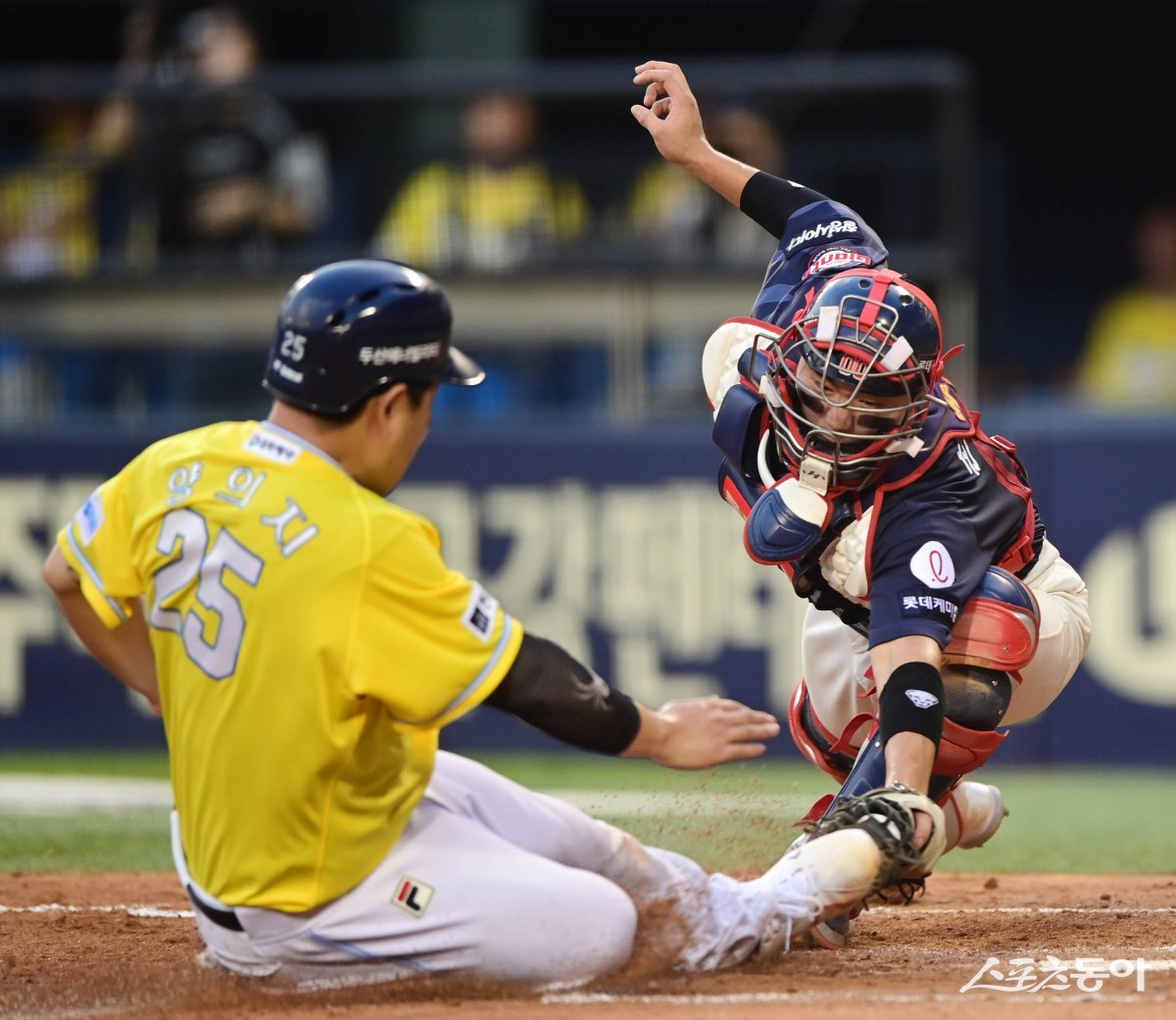 15일 서울 잠실야구장에서 열린 ‘2024 신한 SOL 뱅크 KBO리그’ 롯데 자이언츠와 두산 베어스의 경기에서 3회말 1사 1, 3루 두산의 뜬공 때 롯데 포수 손성빈이 3루주자를 태그 아웃시키고 있다. 잠실 | 주현희 기자 teth1147@donga.com