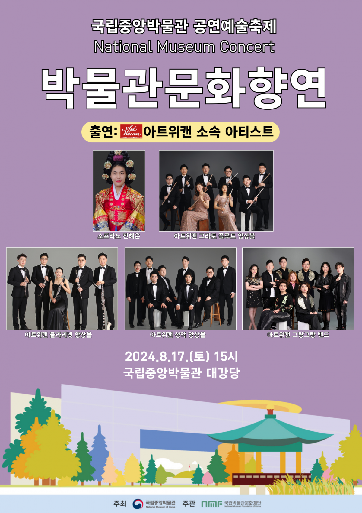 아트위캔과 함께하는 ‘박물관문화향연 공연’은 지적장애 소프라노 전해은 씨의 드라마 ‘명성황후’ OST ‘나 가거든’을 오프닝으로 그라토플루트앙상블, 아트위캔 클라리넷앙상블과 성악앙상블 등 발달장애인으로 구성된 클래식 부문 앙상블이 출연한다. 지난달 이탈리아 국제교류 공연을 성공적으로 마치고 돌아온 아트위캔 그랑그랑 팝밴드가 더위를 날려버릴 폭발적인 열정의 무대로 대미를 장식할 예정이다.