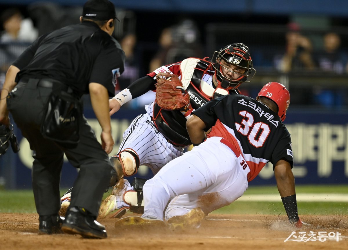 18일 서울 잠실야구장에서 ‘2024 신한은행 SOL뱅크 KBO리그’ KIA 타이거즈와 LG 트윈스 경기가 열렸다. 8회초 2사 1루 KIA 2루타 때 1루주자 소크라테스가 홈까지 달렸으나 아웃되고 있다. 잠실|김종원 기자 won@donga.com